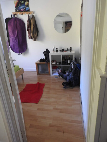 Kamer 1: 2.5 X 2 m met de kast op de overloop (€ 525/maand) kaal.