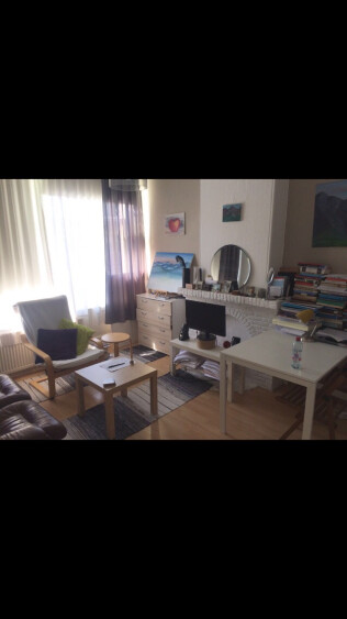 De kamer van 22m2 ligt aan de voorkant van het huis en heeft grote ramen. Verder delen we de badkamer, keuken en een balkon waar we lekker kunnen bbq’en in de zomer.