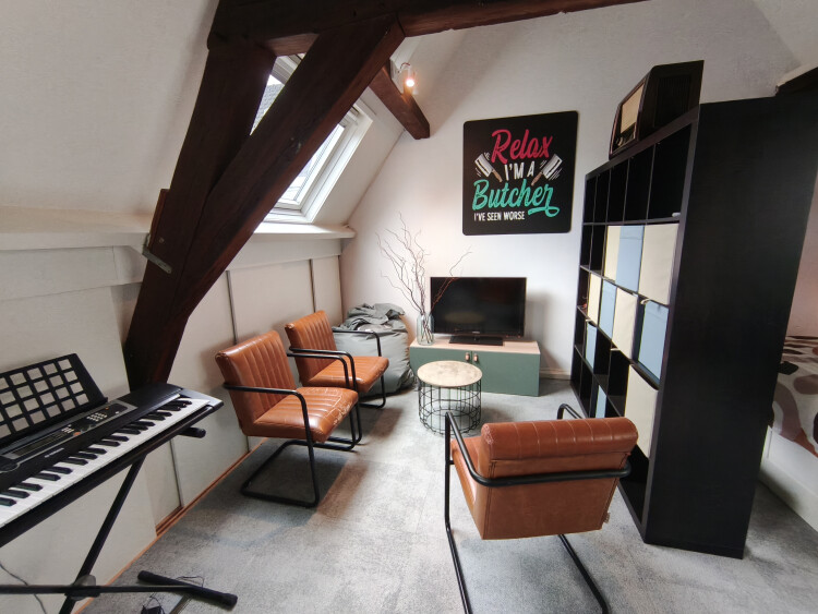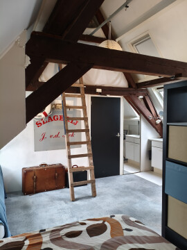 De foto's zijn niet actueel. We hebben de verdieping voorzien van tapijttegels en de kamer is gemeubileerd. Dit betekent: Bed van 1.40m x 2.00m. Opbergkast, zithoek met tv, logeerbed, wastafel, opbergruimte achter schotten. Foto's volgen snel.