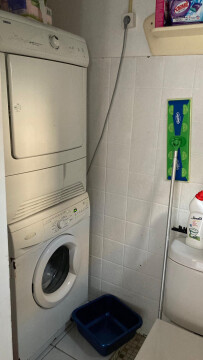 Eettafel/4 stoelen, bankstellen met tafel, plafondhang lampen/woonkamer, wasmachine/droger (washok), koelkast, vriezer, gasfornuis etc.